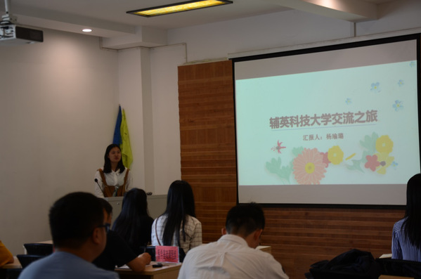 学生代表杨瑜璐、王卓敏、沈淑敬分别从学习感悟、校园介绍、当地人文、学生活动四个方面,向在座教师介绍了为期五个月的台湾辅英科技大学学习交流经历。汇报后,师生之间就双方学校在专业课程设置、课堂教学风格等方面的区别做了进一步的沟通交流。张燕肯定了学生们的精彩汇报,以及年轻人“走出去看世界”的勇气。她勉励学生多争取和珍惜外出学习交流的宝贵机会,从而增广见识,开阔眼界,使自己更为包容,更为谦逊,更富创见。