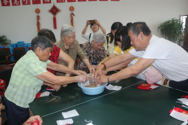 40多名爷爷奶奶参加了驱蚊“香囊”的制作,老师、同学围在老人身边,手把手教爷爷奶奶制作“香囊”,耐心地向他(她)们介绍“香囊”内中药的组成以及“香囊”的作用,老人们一边仔细听着,一边聚精会神地动手制作“香囊”,当老人们做完精美香囊时,一个个露出满意的微笑。