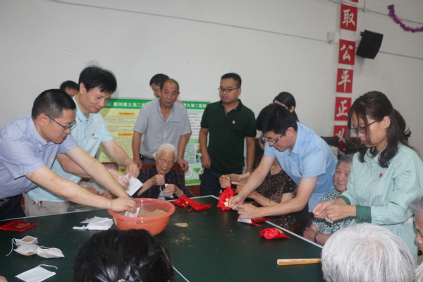 一个上午,共制作300余个香囊,除赠送在场的老人外,医学院党总支委员还分组去病房,为未能来现场制作的老人送去香囊,带去祝福。在现场,有两位90多岁的老党员,他们希望戴上党徽,庆祝党的70周岁生日,得知此事,医学院党总支书记余文富亲自为他们每人送上一枚党徽,支部书记徐春岳老师为两位老人佩戴上党徽,老人洋溢着幸福的笑容。