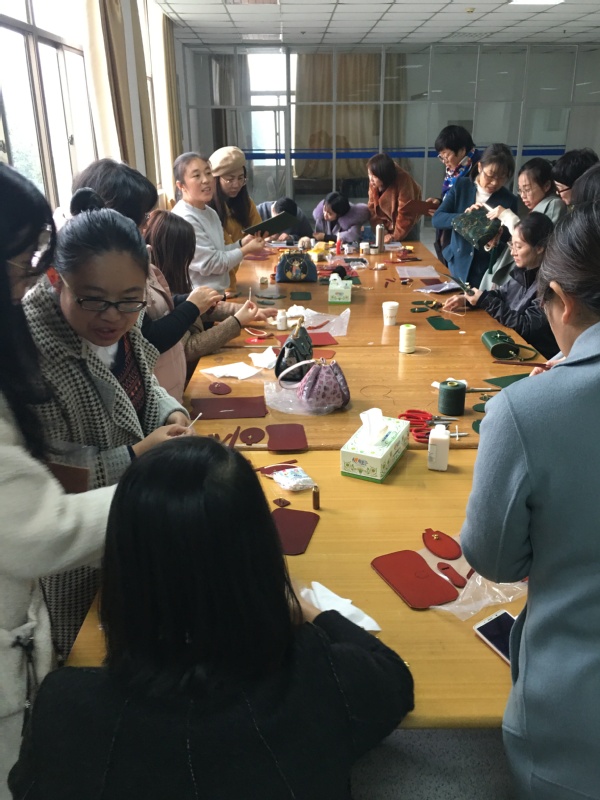 日前,女教职工DIY手工协会在学校图书馆提供的活动室,开展了手工制作皮具的活动。