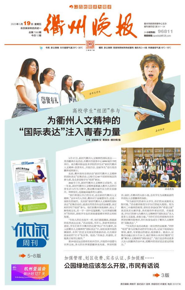 “今天的沙龙活动真是一场宝贵的实践课。”同样“组团”参与征集活动的学生徐心怡,记录下现场每位领导、嘉宾、专家提出的建议,收获颇丰。在征集活动截止日期(5月31日)之前,她打算和小伙伴们继续“打磨”衢州城市精神的“国际表达”,“我们也会带动更多人加入到翻译活动中来,把衢州的美好送去更远的地方。”