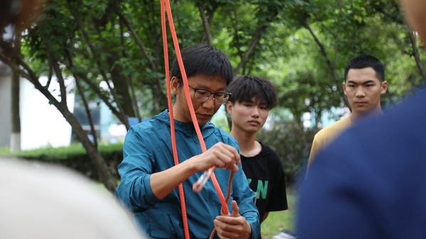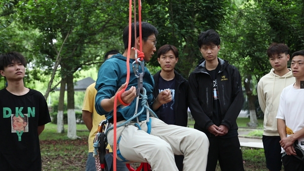 在攀树实操环节,张督成总是拿“放大镜”观察学生。潘豪杰回忆,自己第一次用“挺身式上攀技术”攀树时不太顺利。张督成在旁边仔细观察了几分钟,发现了症结所在。“你的布莱克式抓结多打了一圈,导致它摩擦力增大,难以上下移动。还有你的发力点错了,应该是腰腹,而不是腿部。”张督成重新帮他打了绳结,用手指在他腹部精准圈定了发力部位。潘豪杰仿佛瞬间被打通任督二脉,攀起树来又快又好。