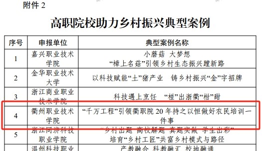 近日,浙江省教育厅办公室公布第三届高校助力乡村振兴典型案例名单。由我校继续教育学院申报的《“千万工程”引领衢职院20年持之以恒做好农民培训一件事》经高校互评、专家联评、省教育厅会评等环节,成功入选浙江省教育厅办公室第三届高校助力乡村振兴典型案例高职院校组15个典型案例之一。