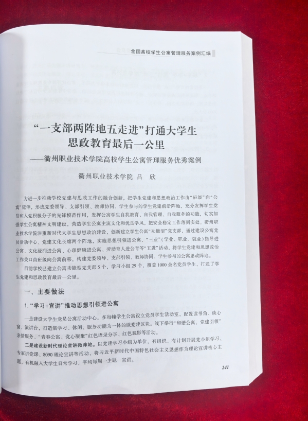 近日,由中国教育后勤协会学生公寓管理专业委员会面向全国高校开展的高校学生公寓管理服务优秀案例征集活动评选结果正式揭晓。由我校报送的《“一支部两阵地五走进”打通大学生思政教育最后一公里》成功入选案例汇编。全省仅有4所高职院校案例入选,我校是其中之一。