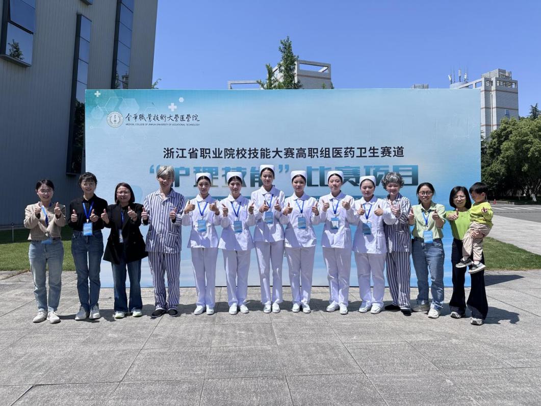 4月14日至4月15日,2025年浙江省职业院校技能大赛高职组护理技能赛项在金华职业技术大学举办,全省14所院校的27支队伍展开激烈角逐。根据赛制要求,参赛队伍需自主确定项目,围绕技能水平、职业素养等要素设计内容并选择设备,由2-4名选手通过团队协作,在1小时内同步完成技能操作与现场讲解。我校医学院参赛选手操作规范精准、讲解清晰流畅,团队配合默契,充分展现了扎实的专业技能和良好的职业素养。最终,吴书仪、潘浩燕、鲁佳慧团队(指导教师:刘瑞芳、李良秀)荣获金奖,王玮萍、陈子怡、郑嘉媛团队(指导教师:饶艳、周敏)获得银奖。